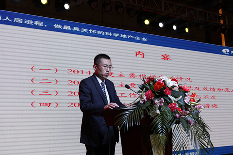 會(huì)議隆重表彰了2014年度在不同崗位上作出突出貢獻(xiàn)的先進(jìn)集體和個(gè)人。其中,開(kāi)發(fā)部、銷(xiāo)售團(tuán)隊(duì)被授予績(jī)效鉆石組合獎(jiǎng),綜合辦公室被評(píng)為服務(wù)鉆石組合獎(jiǎng)。公司總經(jīng)理助理錢(qián)永彩、華府項(xiàng)目部經(jīng)理姬常寶分別作為受表彰人員代表上臺(tái)發(fā)言。