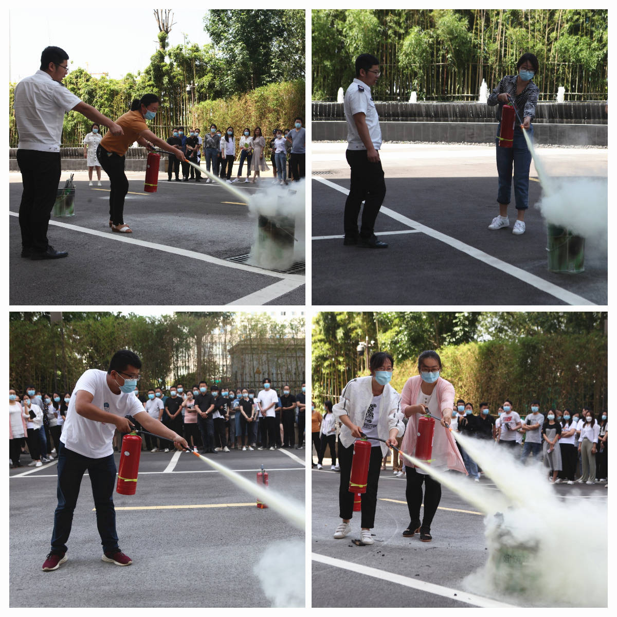 消防演練中,員工學(xué)習(xí)操作滅火器